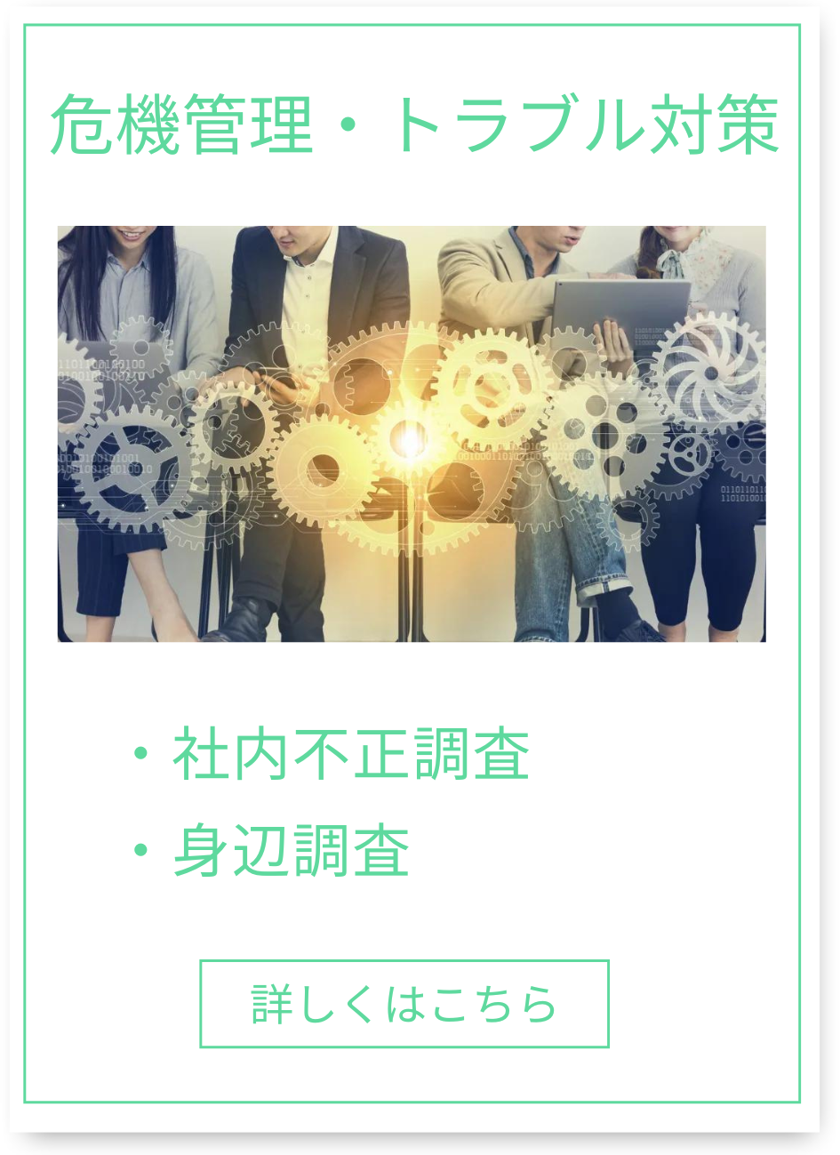 提携パートナーとして調査機関を有し、弁護士や社労士では難しい証拠収集なども行い御社の危機を防衛いたします。