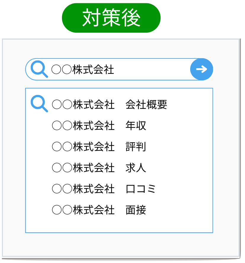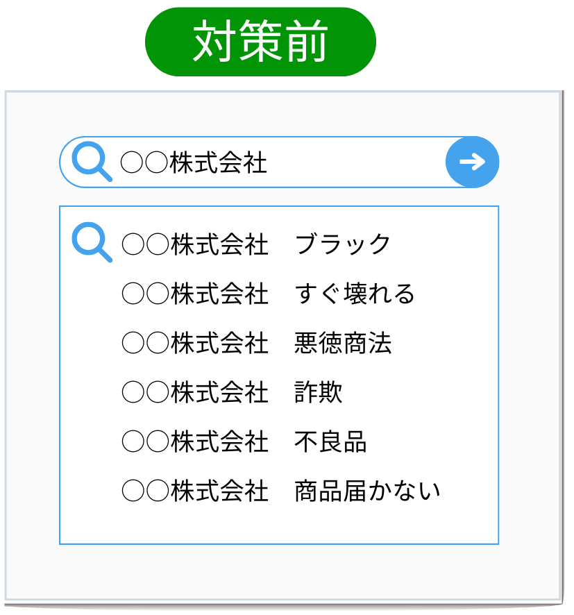 Googleなどで検索した際に表示される検索候補に対して施策を行い、対象となるキーワードを、表示もしくは非表示にします。